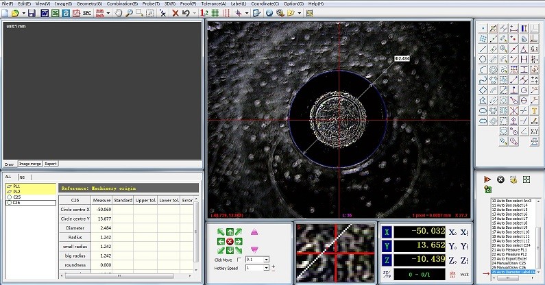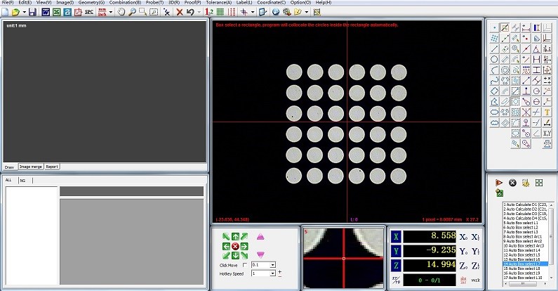Auto focusing, automatic measuring, matrix measuring, and DXF file import for comparison with part images or measured graphics.
